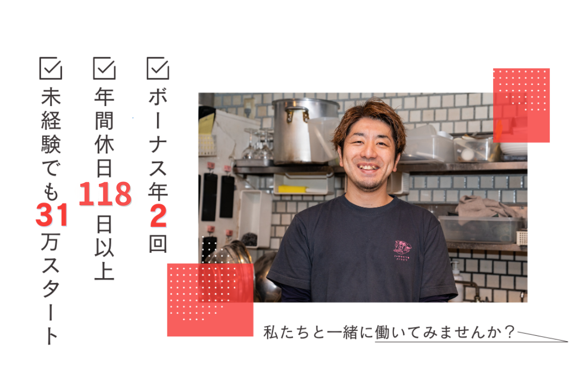【 オンラインでもOK◎まずは面談だけでも!24時間WEB受付中 】 / ✦ ここがPOINT ✦ エンヤフードサービスで働く魅力は? \ ✔️ 希望によって選べる休日・働き方! ------------------------------------------------------- ①月給31万円~ ・月9日休み(シフト制) ②月給28.5万円~ ・完全週休二日制 ・曜日は相談OK ③月給23万円〜 ・月10日休み ------------------------------------------------------- ✔️ 高水準の給与設計◎飲食業でも稼げます ⇢ 未経験でも31万円スタート!店長候補は月収38万円〜、マネージャー採用の場合は月給41万円〜。ボーナス年2回&インセンティブ・目標達成手当もあり。スタッフが居てこそのえんやグループと考え、頑張りをしっかり形で還元します! ✔️ 1年以内に昇格も◎キャリアアップの道 ⇢ キッチン・ホール ⇨ 副店長 ⇨ 店長候補 ⇨ 店長⇨マネージャー..とキャリアアップの道は無限大!入社1年以内に店長に昇格したスタッフもいます。研修制度も充実しているから、未経験者でもキャリアアップが目指せます! ✔️ 福利厚生充実◎しっかり休んで働けます ⇢ 年間休日118日・選べる休日制度・夏季&冬季休暇(5日)・10連休可! 扶養手当(配偶者10,000円・子5,000円)など手当も充実◎ あなたの理想のライフワークを当社で叶えてください! ✔️ 独立実績多数◎あなたの夢が叶います ⇢ 当社で活躍後の独立実績多数!しっかりとしたスキル・経験を身に付け、独立を実現させてください! ✔️ チームワーク重視◎アットホームな社風 ⇢ 20代・30代が中心の活気のある会社!女性社員も活躍中!アルバイトからの社員登用や復職したスタッフもいます。当社の一番の魅力は人間関係が良いところ。楽しく働ける環境です!